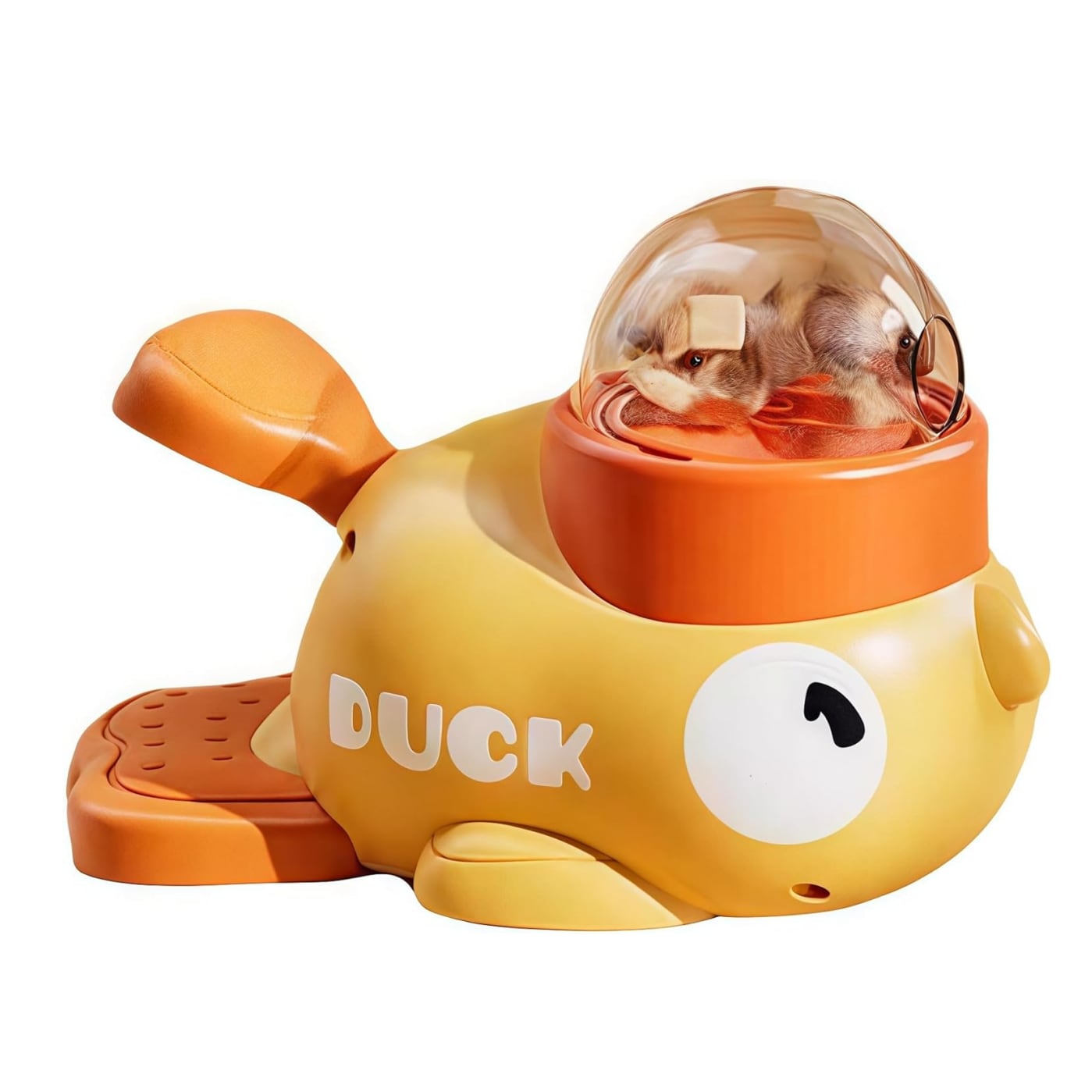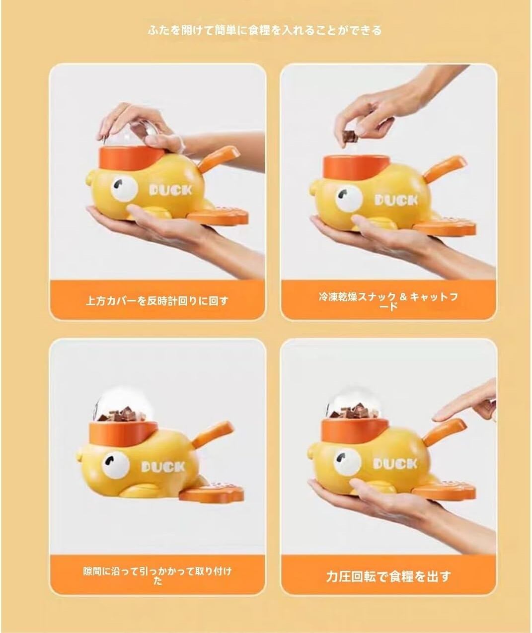アヒルデザインでペットの興味を引き、ボタン一つでフードが出ます。狩猟本能を刺激し、達成感でストレス解消&食欲アップ!
